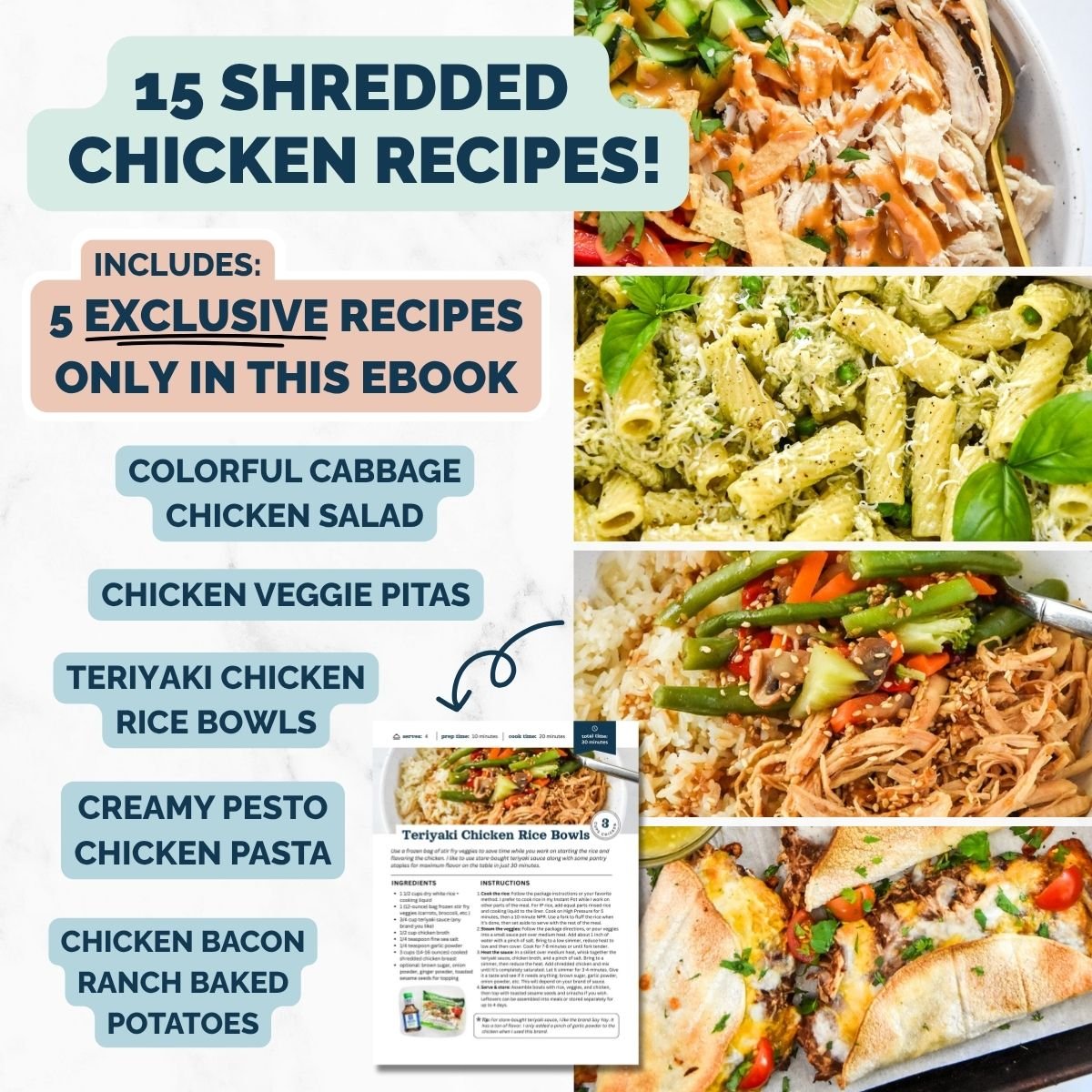 ➡️ 15 easy, flavorful dinner recipes - All starting with shredded chicken including 5 recipes EXCLUSIVE to this eBook!